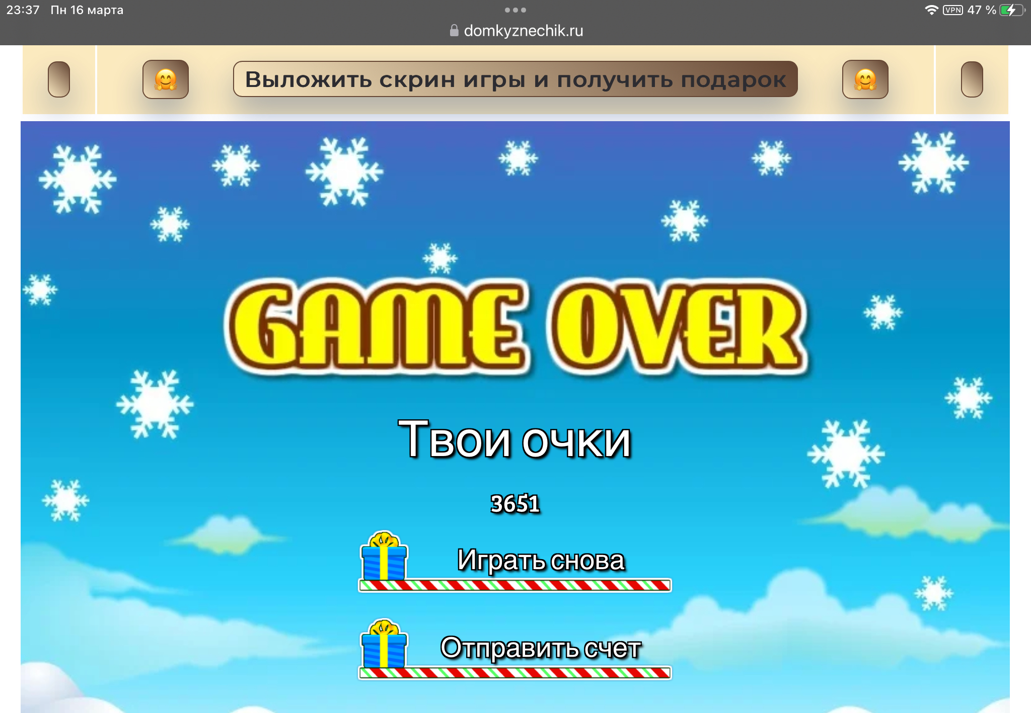 <tr><td height="35" style="background:url('') #4a150e;padding-top:7px;color:#FAE8C0;" align="center"><b>Сыграй в игру,выложи скрин и получи приз.В сутки 5 🎁 <br />