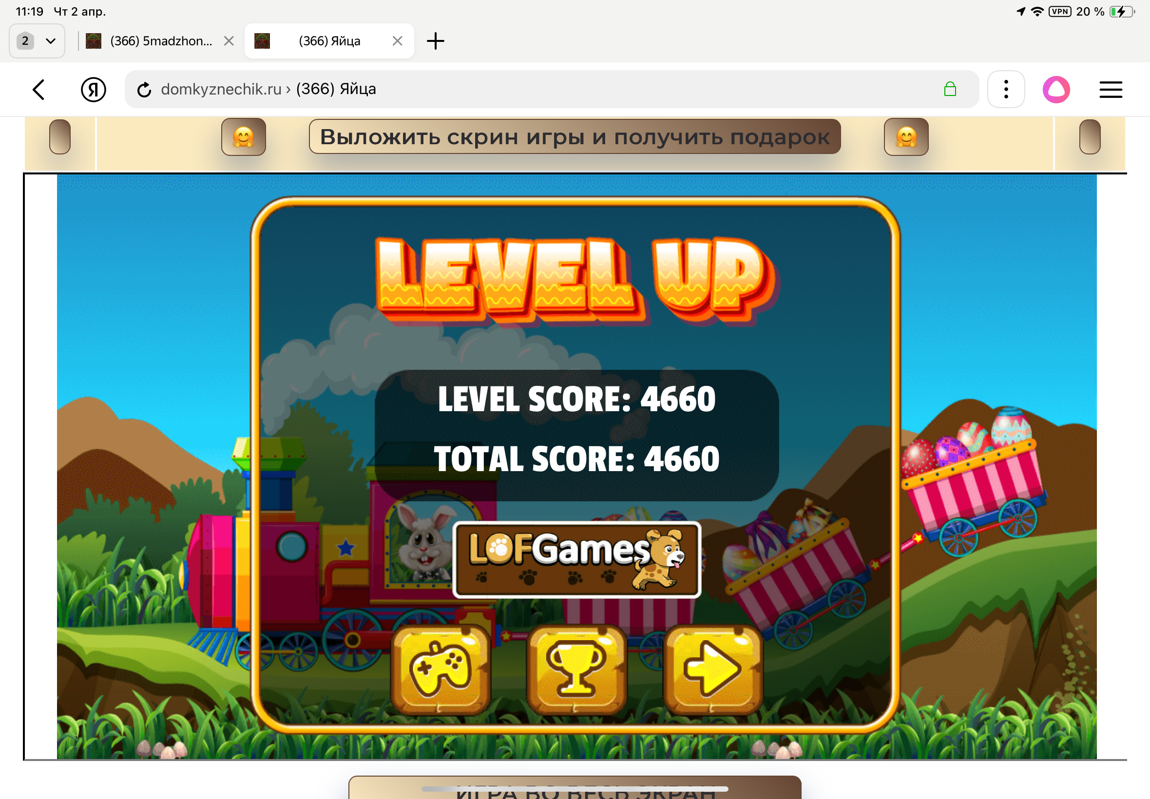 <tr><td height="35" style="background:url('') #4a150e;padding-top:7px;color:#FAE8C0;" align="center"><b>Сыграй в игру,выложи скрин и получи приз.В сутки 5 🎁 <br />
