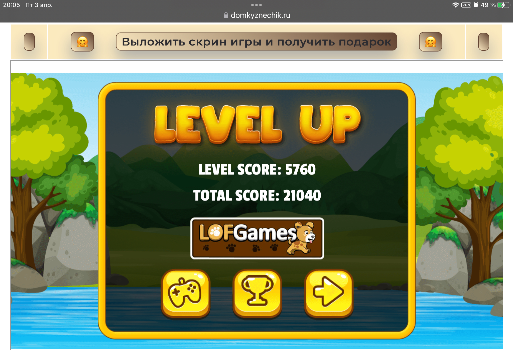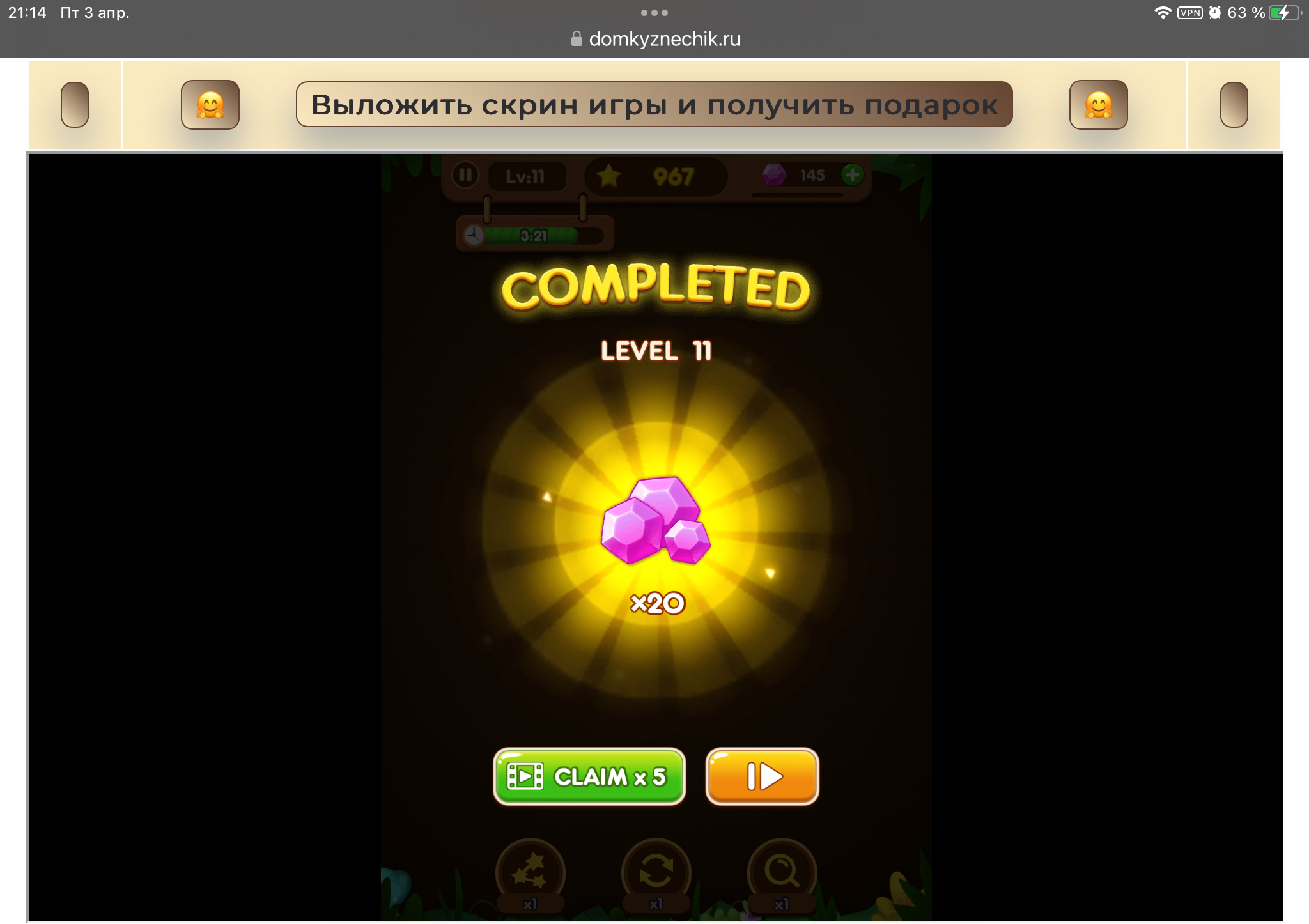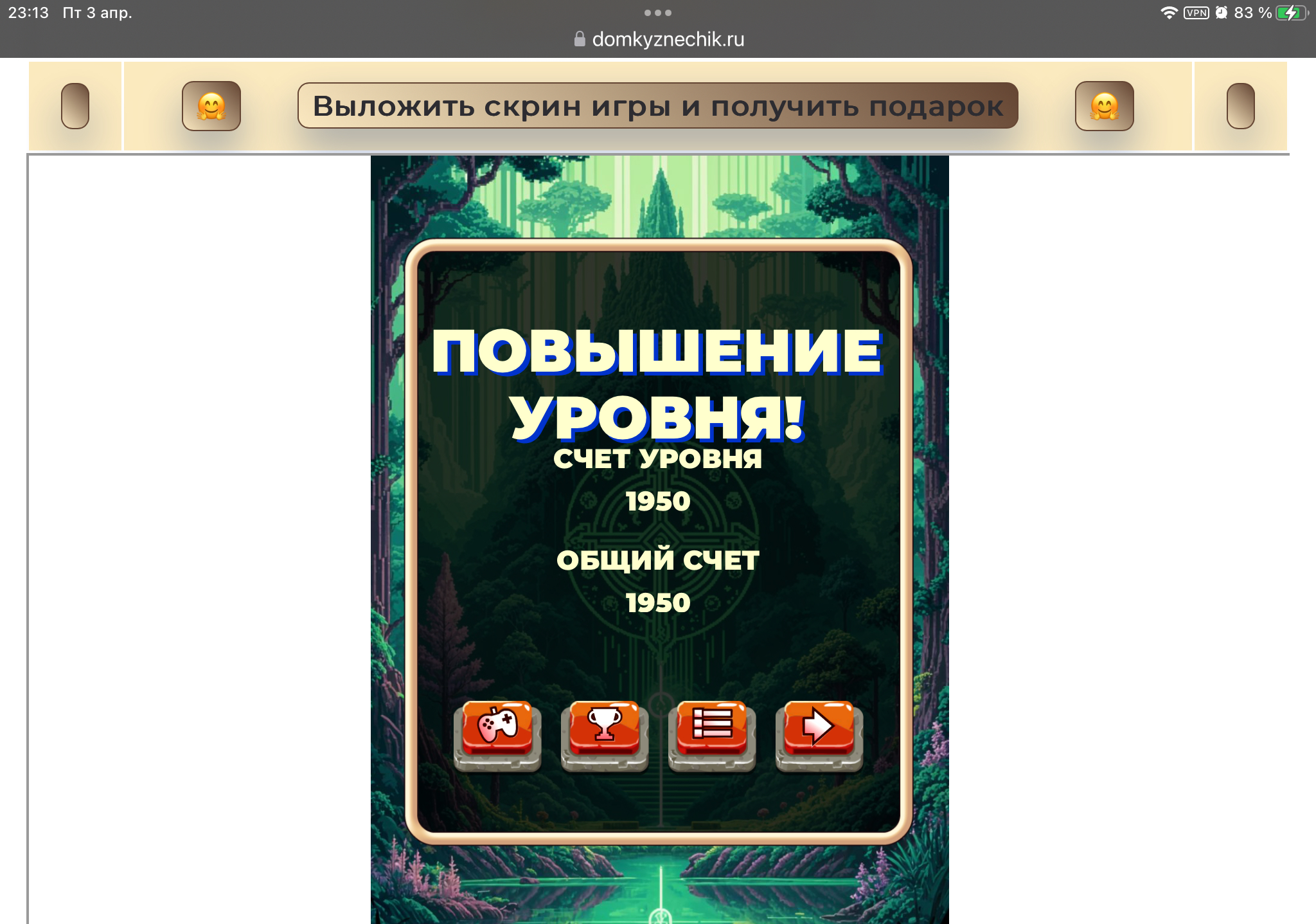 <tr><td height="35" style="background:url('') #4a150e;padding-top:7px;color:#FAE8C0;" align="center"><b>Сыграй в игру,выложи скрин и получи приз.В сутки 5 🎁 <br />